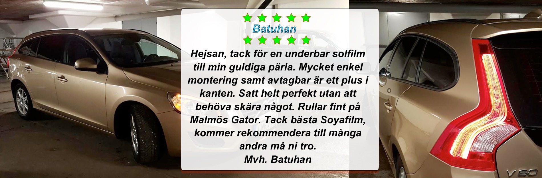 SOYAFILM® - Originalet. Avtagbar, återmonterbar unik solfilm utan klister monteras enkelt på alla bilar, då filmen är mjuk så följer den glasets form även när det är extremt böjt. Kan monteras av och på hur mycket du vill. |