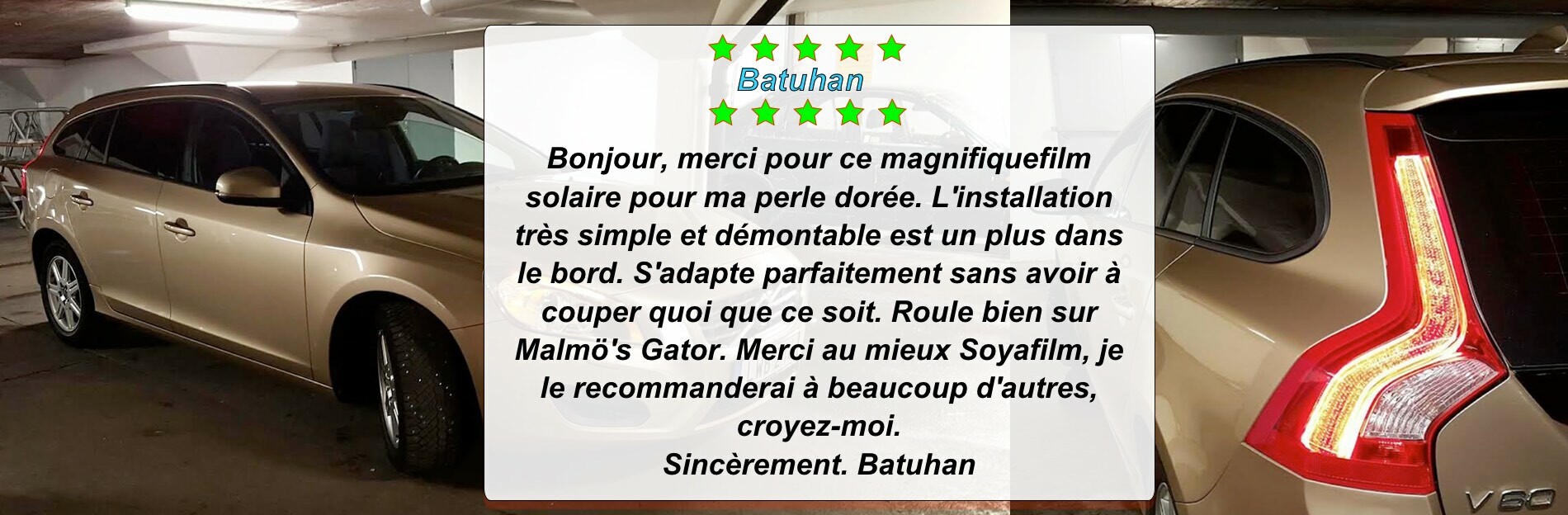 Film solaire teinté prédécoupé pour toutes les voitures et toutes les marques. Nous avons le film teinté et les outils que vous recherchez, que vous soyez débutant ou professionnel.![]() SOYAFILM® - L'original. Le film solaire unique amovible et remontable sans adhésif s'installe facilement sur toutes les voitures, car le film est doux, il suit la forme du verre même lorsqu'il est extrêmement plié. Peut être monté et démonté autant que vous le souhaitez. |